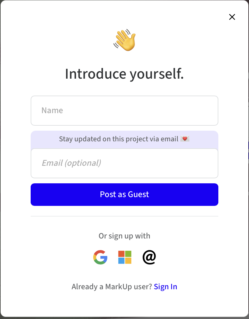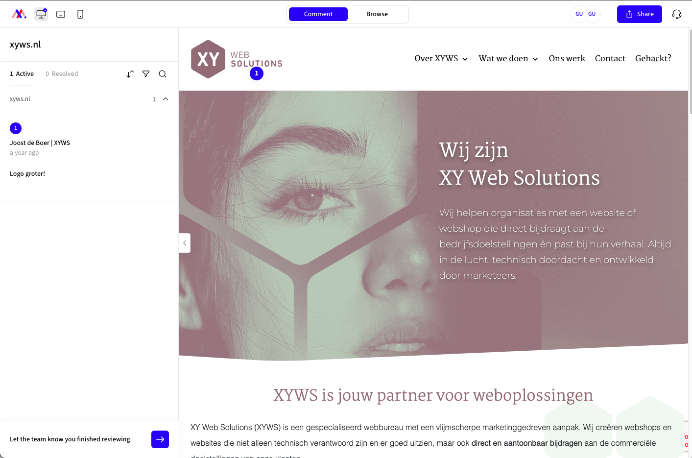 Met Markup kun je eenvoudig opmerkingen plaatsen op je website, precies op de plek waar iets verbeterd of aangepast moet worden. Je hoeft geen account aan te maken – alleen je naam is genoeg.