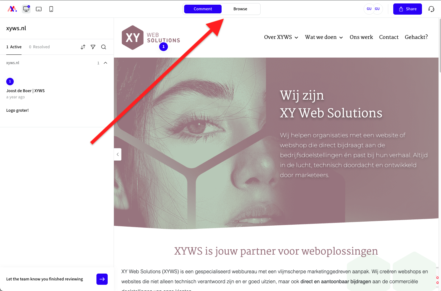 Klik op de link die je van ons hebt ontvangen. De website opent direct in een Markup-venster. Je ziet de site zoals normaal, maar binnen een kader met een menubalk bovenin met 2 knoppen: ‘comment’ en ‘browse’. De functie die actief is is blauw gemarkeerd.