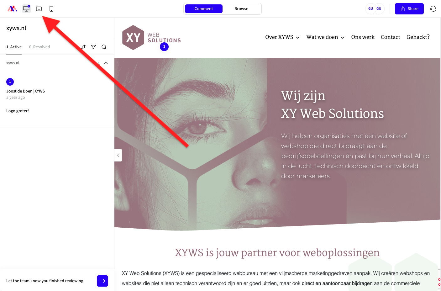 In de bovenbalk, links naast het Markup-logo, staan kleine icoontjes voor desktop, tablet en mobiel. Klik hierop om te zien hoe de site er op verschillende apparaten uitziet. Zo kun je ook feedback geven op de mobiele of tabletweergave.